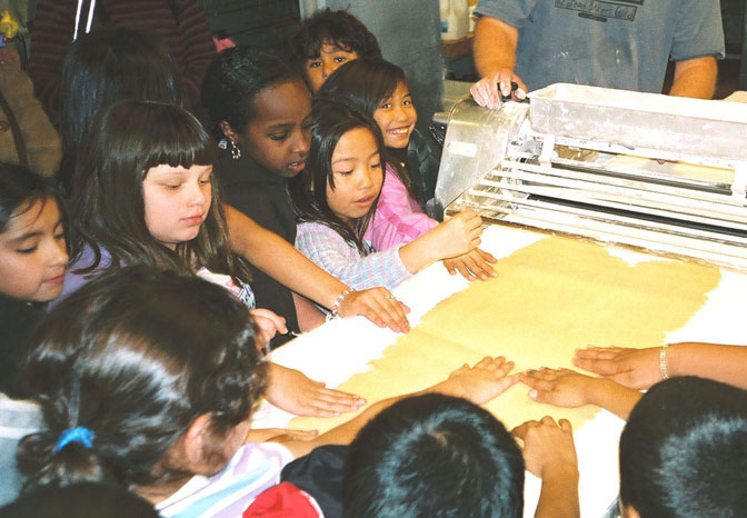 On November 30th, three adults and 18 third graders from the Excel after-school program visited the Noe Valley Bakery & Bread Company at 4073 24th Street. Owners Michael and Mary Gassen greeted us outside and led us into the crowded kitchen, where workers continued their tasks, squeezing by us carrying trays loaded with goodies. Michael, a large, jovial man wearing a white apron, held the group's attention for 45 minutes with an entertaining lecture/demonstration. He displayed many kinds of flour and yeast, explained how bread is made, and sliced samples of flavored sourdough breads for us to try. Then he showed off his cookie dough machine -- a combination rolling pin and conveyor belt -- with which the bakery turns out 10,000 cookies each Christmastime. He even let the group handle some cookie dough, which he later discarded. At the end, everyone was given a delicious fresh-baked chocolate chip cookie and a cup of milk. Thanks Michael for giving us your time and cookies in the middle of your busiest season! The Web site is www.noevalleybakery.com.